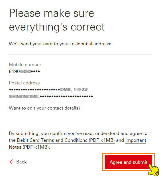 最後にカードの発送先住所を確認されますので、問題なければAgree snd submitをクリックします。